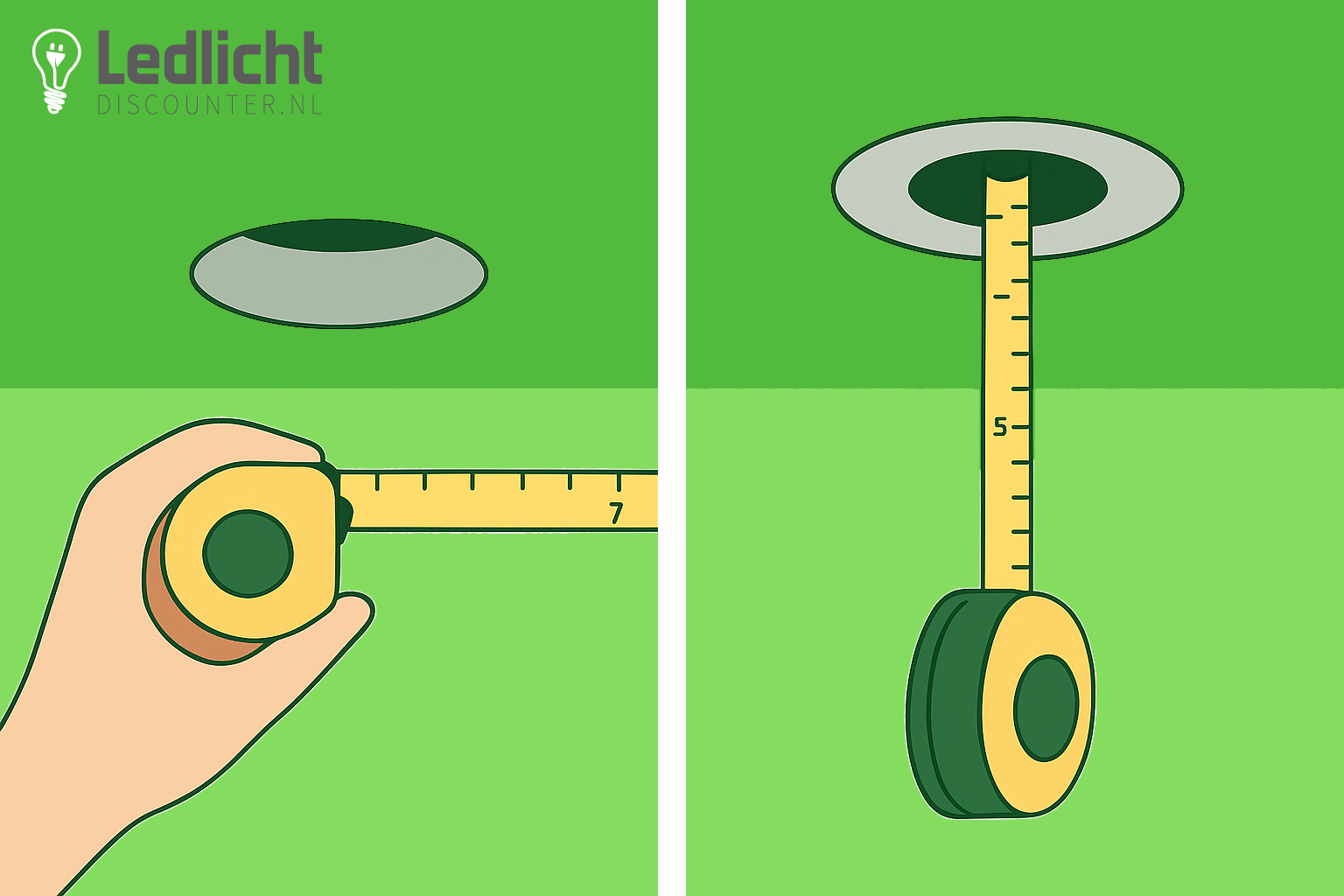 De Gatmaat (Zaagmaat): Meet de diameter (de doorsnede) van het gat in je plafond. Van de ene rand naar de andere. Schrijf dit getal op. Dit is de belangrijkste maat die je nodig hebt.
