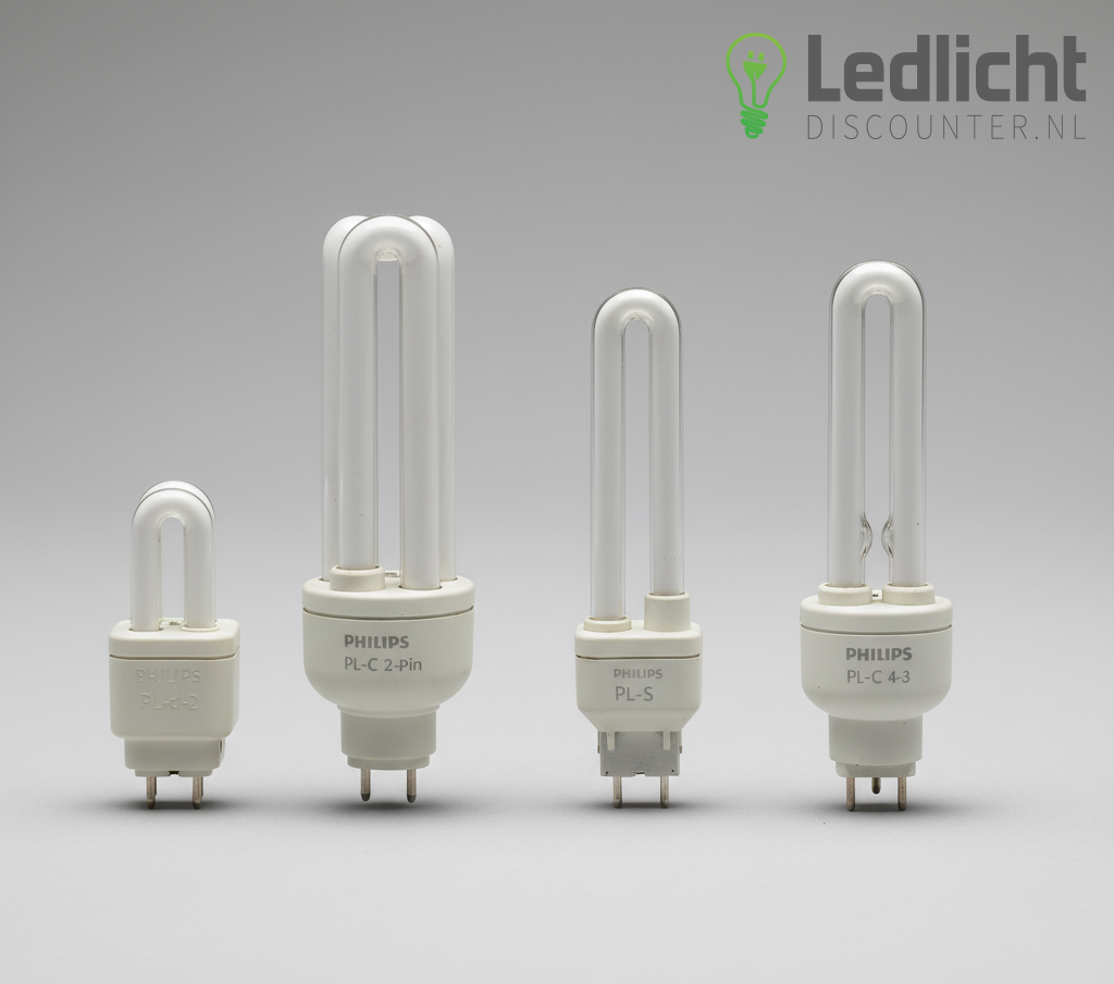 PL-C (Compact): De meest voorkomende. Deze lamp bestaat uit twee dubbelgevouwen, U-vormige buisjes.